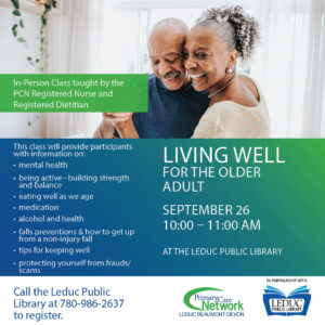 This is an in-person class taught by the PCN Registered Nurse and Registered Dietitian, being held at the Leduc Public Library.